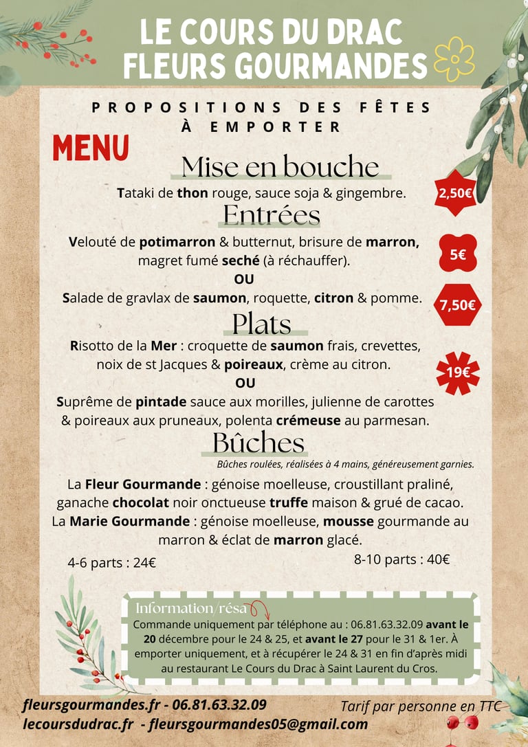 Propositions pour les fêtes de fins d'année. Uniquement à emporter.